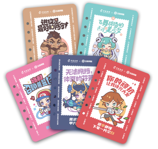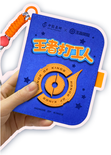 以打工人的视角,通过拆排英雄人物姓名,用李白、貂蝉、蔡文姬、程咬金和鲁班七号谐音梗制作职场打工人语录,从而引发玩家打工人共鸣。产品创新性使用毛毡本、冰箱贴、便签贴、明信片组合形式,兼具美观性、可玩性和实用性。