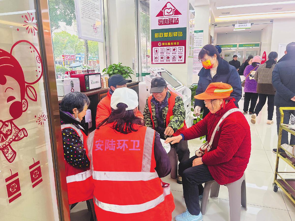 湖北省安陆市邮政分公司邀请户外劳动工作者来到东城邮政支局“爱心驿站”共度“腊八”。环卫师傅们围坐在一起,喝着浓郁香糯的腊八粥,感受着邮政的爱心和温暖。□包静 摄影报道