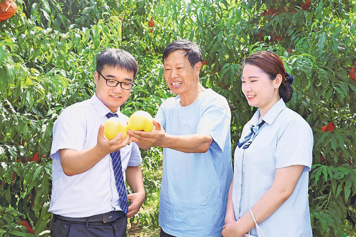 近日,在河北省廊坊市永清县富民合作社的桃子丰收之季,邮储银行永清县支行客户经理深入桃园,详细了解桃子的长势,与果农分享丰收的喜悦,并向果农讲解综合金融服务方案,为其解决“融资难”“结算难”“记账难”等问题。