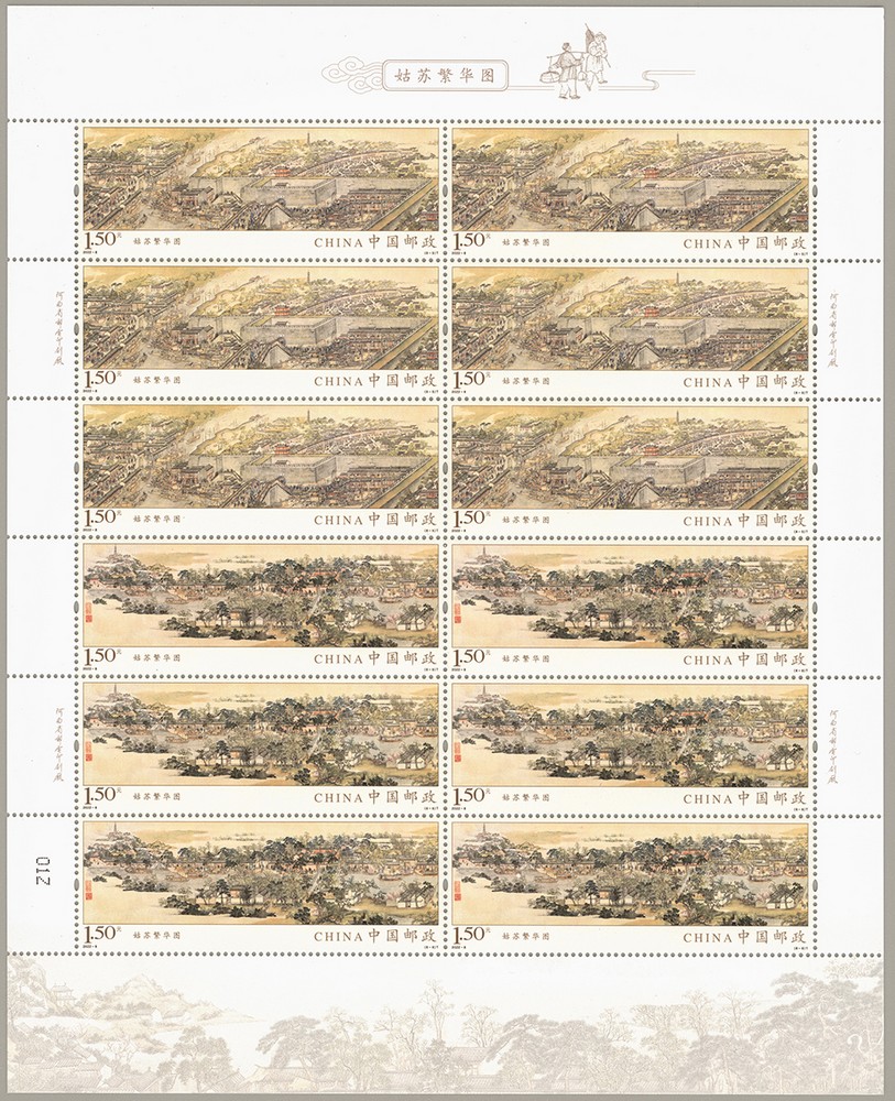 中国邮政定于2022年5月18日发行《姑苏繁华图》特种邮票一套6枚。全套邮票面值为7.40元,邮票计划发行数量为730万套。另发行长卷邮票折,计划发行数量20万本。